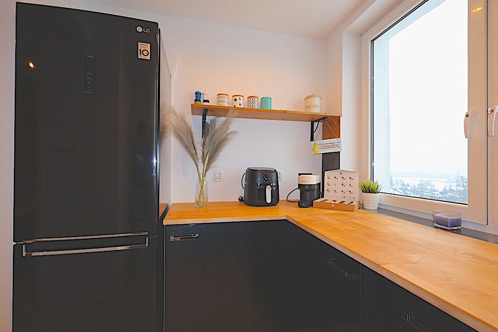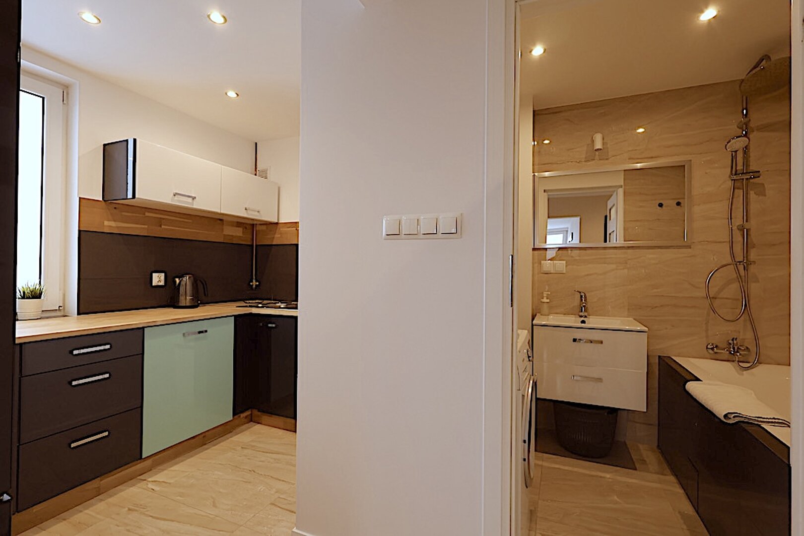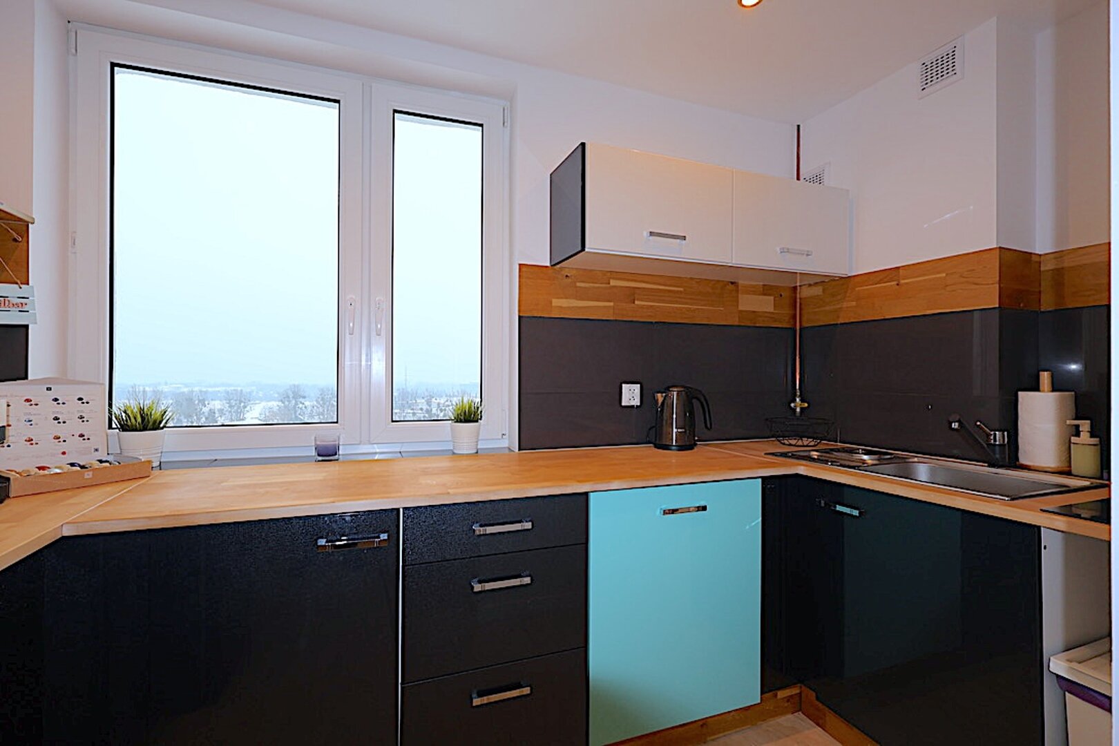 Aneks kuchenny: czajnik | lodówka | zmywarka | płyta indukcyjna | piekarnik | sztućce | naczynia | garnki | ekspres do kawy |